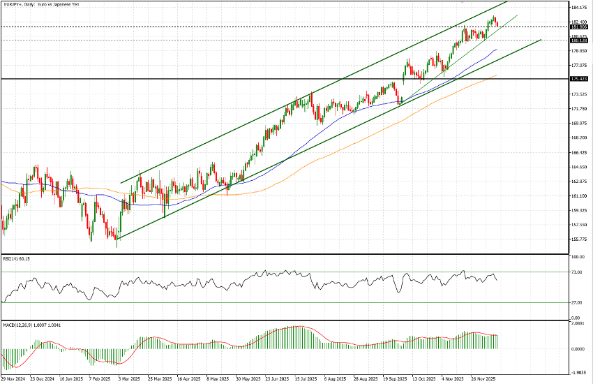 El EUR/JPY mantiene una tendencia alcista persistente —reflejo de una debilidad sostenida del yen— desde el 28 de febrero de 2025, cuando el cruce marcó un mínimo en 154,79, frente al nivel actual de 182,02. Desde una perspectiva operativa, un aspecto constructivo de este movimiento ha sido su carácter ordenado: la acción del precio ha respetado en gran medida un canal alcista bien definido, con salidas puntuales y de corta duración fuera de sus límites.