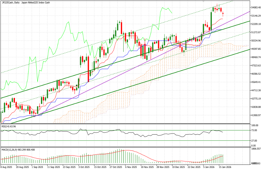 El indicador Ichimoku se mantiene claramente positivo, con el precio cotizando por encima de la nube, que es relativamente estrecha, lo que indica una baja volatilidad. La Tenkan-sen (línea rápida) se sitúa por encima de la Kijun-sen (línea lenta), y estos niveles representarían las primeras zonas de soporte en caso de un retroceso. Teniendo en cuenta el tono de aversión al riesgo con el que han abierto los mercados esta mañana tras las tensiones entre Estados Unidos y la Unión Europea, dichos soportes pueden identificarse en torno a los 52.750 puntos —nivel que además coincide con el máximo previo alcanzado por el índice a comienzos de noviembre— y aproximadamente en los 51.500 puntos.