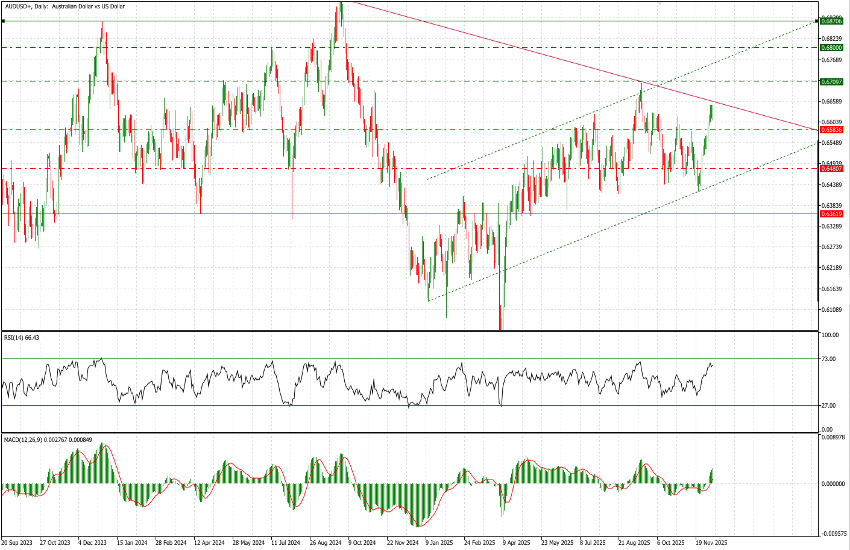Además, el gráfico de largo plazo resulta especialmente relevante: la acción del precio está poniendo a prueba la línea de tendencia bajista de largo recorrido originada en 2021. Para los inversores de medio y largo plazo, puede ser prudente esperar a ver cómo reacciona el mercado ante este nivel estructural. Una ruptura al alza abriría objetivos iniciales en 0,6710, seguidos de 0,6760 y, finalmente, 0,6795. Un movimiento de sobreextensión hacia 0,6870 podría darse si el sentimiento del mercado se tornara más optimista.