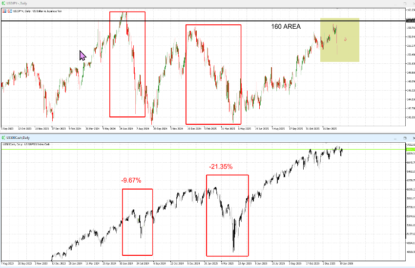 Lo que presentamos aquí no es exactamente un análisis técnico clásico, sino un gráfico diseñado para visualizar la relación entre el USD/JPY y el US500, superpuestos horizontalmente en MT5. Se observa con claridad que los movimientos bajistas del USD/JPY—provocados por intervenciones del MoF (Ministerio de Finanzas)—han sido determinantes y, en general, han precedido o coincidido con caídas del US500 (y, en términos más amplios, de todos los mercados de riesgo globales).