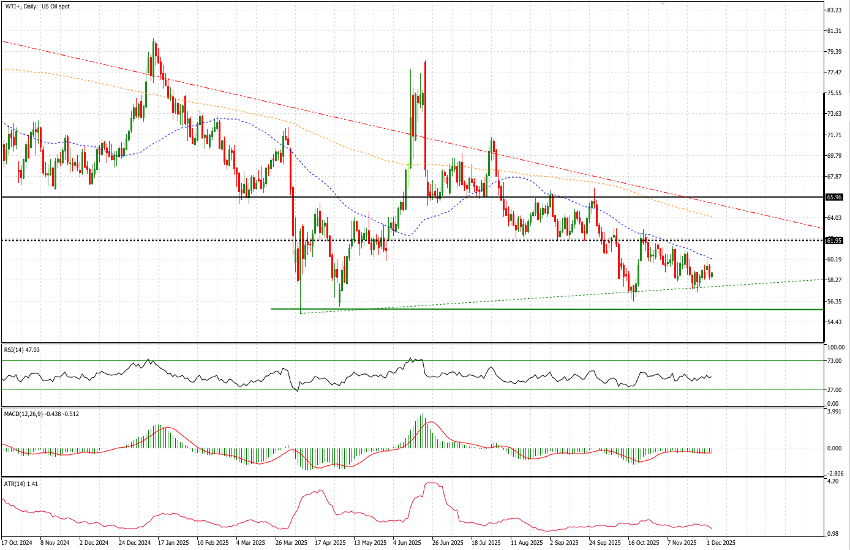 La tendencia de largo plazo sigue claramente bajista. No obstante, en los últimos meses no se han marcado nuevos mínimos, y los operadores parecen identificar un nivel adicional de soporte en la región de 56 dólares, ya testada en tres ocasiones este año. El cierre de ayer se situó en 58,65 dólares, mientras que la volatilidad —según el ATR(14)— se mantiene en niveles históricamente bajos, con un rango medio diario de 1,41 dólares. El MACD continúa en territorio negativo, al igual que las medias móviles de 50 y 200 sesiones (60,17 y 63,77 dólares, respectivamente). La directriz bajista de largo plazo se sitúa actualmente en torno a 64,55 dólares.
