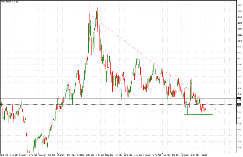 El 4 de abril de este año, el WTI perforó el importante soporte de 66 dólares. A excepción de un breve repunte en junio —cuando el precio alcanzó 78,80 dólares durante menos de dos semanas—, el crudo se ha mantenido consistentemente por debajo de este nivel. Se trataba de un soporte probado en múltiples ocasiones en 2024 y vigente desde 2021. La zona de 62 dólares también presenta relevancia técnica y ha generado reacciones del precio en meses recientes.