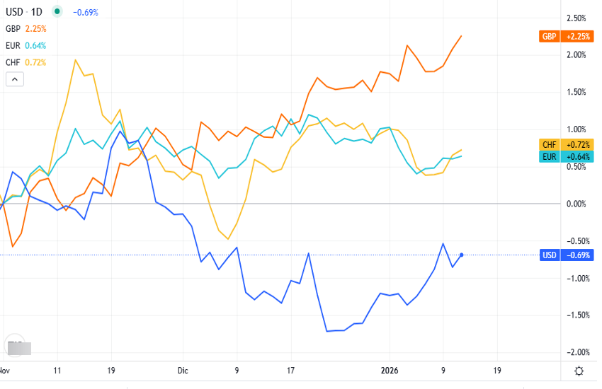 Durante las últimas semanas, el USD había registrado una serie de sesiones de apreciación moderada, claramente visibles frente al euro y al franco suizo. Este movimiento se desarrolló en un entorno de volatilidad persistentemente baja, lo que ha mantenido al índice del dólar (USD Index) moviéndose de forma ampliamente lateral a lo largo de todo el segundo semestre de 2025, tras una marcada depreciación en la primera mitad del año.