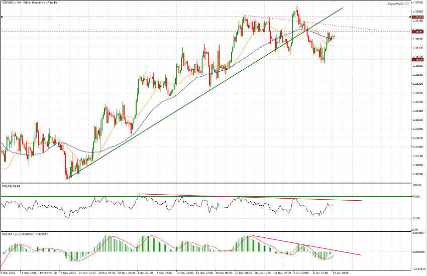 En el gráfico de 4 horas que se muestra a continuación, se aprecia claramente la tendencia alcista del GBP/USD iniciada en noviembre, así como la fase de consolidación más reciente dentro del rango 1,34–1,3530, vigente desde el 20 de diciembre. Se observan ligeras divergencias tanto en el RSI como en el MACD; sin embargo, estas son compatibles con una fase de pausa o consolidación y no implican necesariamente una inversión inminente de la tendencia. La reacción del mercado a la noticia de ayer es visible en las últimas nueve velas, donde se aprecia un rebote contundente desde 1,3391 hasta 1,34845.