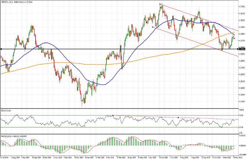 Destaca un elemento técnico clave: el cruce bajista entre las medias móviles de 200 y 50 días—conocido entre los analistas técnicos como death cross, considerado una de las señales bajistas más fiables. Este cruce se produjo el 25 de noviembre alrededor de 1.33. Ayer, el GBPUSD dibujó un inverted hammer (aunque con una sombra superior relativamente corta) tras testear la media móvil de 50 días, con pendiente negativa, en 1.3276.