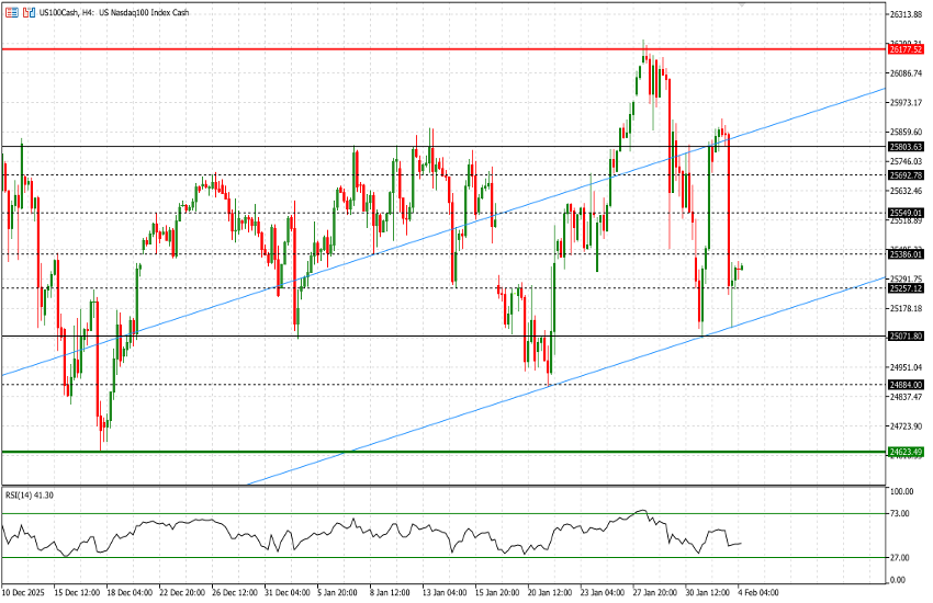 En un momento de la sesión de ayer, el Nasdaq (US100 llegó a caer hasta un 2,3%, llevando al índice, con fuerte ponderación tecnológica, a terreno negativo en el año. El mínimo intradía se situó en 25.112, frente al cierre del 31 de diciembre de 2025 en 25.249, lo que implica una rentabilidad acumulada en el año (YTD) del -0,54%. Posteriormente, el índice logró rebotar hasta 25.338, para cerrar la sesión con una caída del 1,55%.