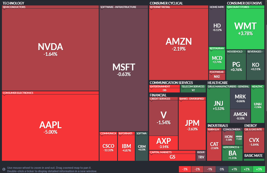 Menciono esto porque ayer, mientras el US30 retrocedía desde sus máximos históricos con un pullback del -1,34%, el Dow Jones Transportation cayó con fuerza un -4,04%. Es importante destacar que las pérdidas en el US30 —como se aprecia en el mapa de calor— siguen siendo atribuibles en gran medida a las grandes tecnológicas. Apple Inc. registró su peor jornada en casi un año, y los únicos sectores en terreno positivo fueron Consumo y Salud.