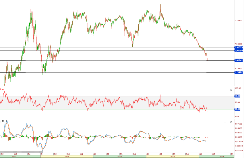 A día de hoy, el USDCNH cotiza en 6,8358, lo que representa un mínimo de 33 meses. El yuan ha acelerado su ritmo de apreciación en las últimas sesiones. Este movimiento es relevante por varias razones. Durante los últimos quince años, las autoridades chinas han gestionado activamente el tipo de cambio, permitiendo a menudo la depreciación del renminbi en periodos de desaceleración económica para sostener la competitividad. Desde 2022, el rango 7,20–7,35 en USDCNH se había convertido en un umbral crítico al alza, reflejando tensiones estructurales en la economía china.