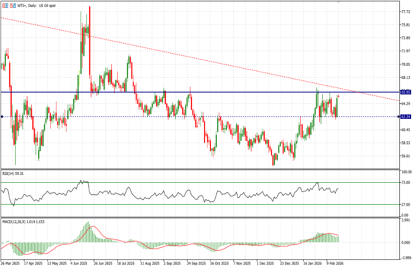 La línea descendente roja discontinua representa la tendencia bajista vigente desde septiembre de 2023. Conviene actuar con cautela, ya que la elevada volatilidad del WTI ha distorsionado esta directriz con el tiempo, lo que implica que distintos operadores pueden haberla trazado con inclinaciones ligeramente diferentes.