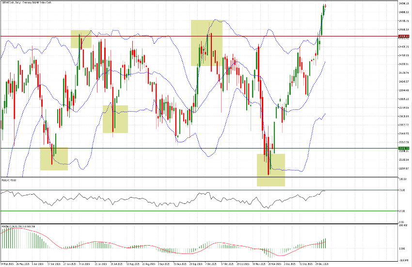 A review of recent months on the German index highlights the reliability of this signal. The Bollinger Bands were breached on June 19, July 9, August 1, and November 20, each time followed by a reversal. Only the October 2 breakout resulted in a brief consolidation lasting several days before prices resumed their decline; even in that instance, the breach occurred to the upside. This supports the view that the signal carries a high statistical probability, while acknowledging—as with all technical indicators—that it is not infallible.