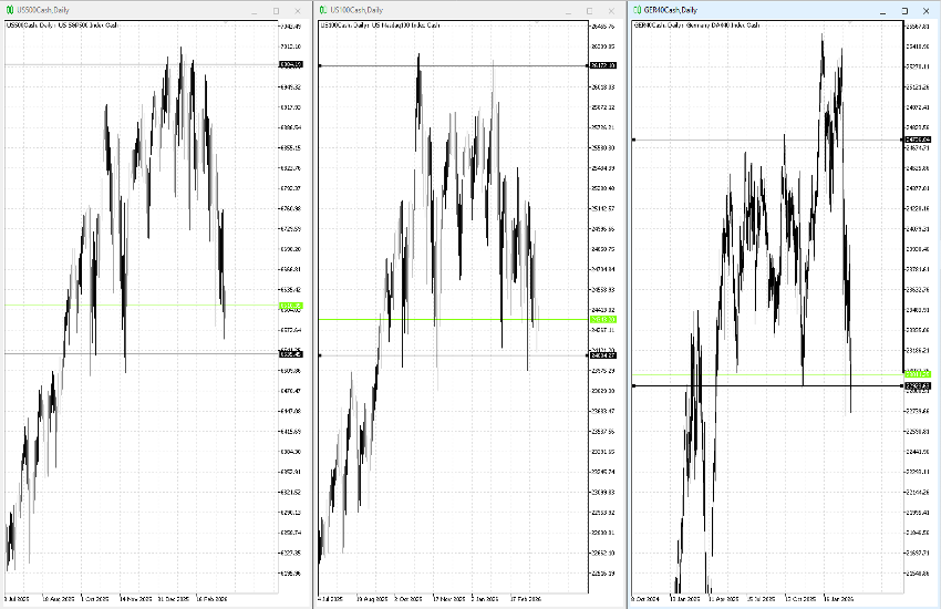 On one side, we have the S&P 500, Nasdaq, and DAX: for months—generally since early summer 2025—they have been trading in a range, albeit a wide one, and are now sitting on very clear and important static support levels: respectively 6550 / 6600, 24300 / 24000, and 22950 / 22700. A break below these areas would likely trigger a rapid extension of the downside move; at the same time, we expect buyers to step in around these levels, at least to try to support prices temporarily.