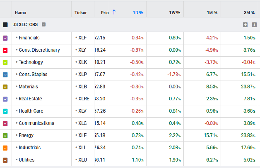 Foi mais um dia negativo em Wall Street, ainda que de forma moderada, mas desta vez a “novidade” foi que o setor mais pressionado não foi tecnologia, e sim o financeiro. Com desempenho diário de -0,84%, o setor financeiro sofreu maior pressão vendedora do que os setores de consumo (Discricionário -0,67%, Básico -0,42%), impactando principalmente o DJ30, que foi o índice mais fraco entre os principais, com queda de -0,54%.
