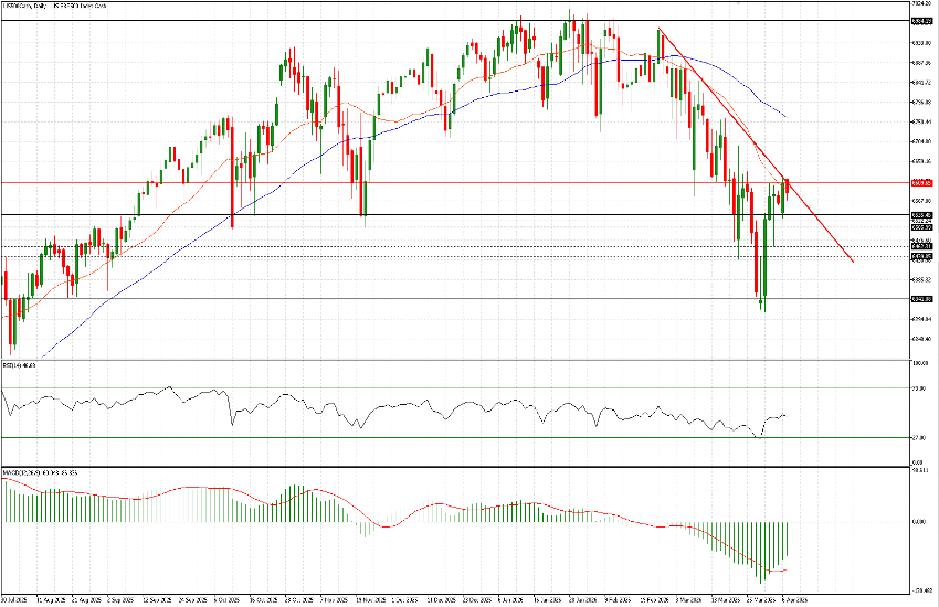 The situation is now at a crossroads. The rebound has pushed price above the key 6536 level, where the index consolidated during yesterday’s low-volume session. Today’s opening was slightly above the next resistance area at 6610, as well as above the 21-day moving average and the clearly defined downtrend line originating on February 25.