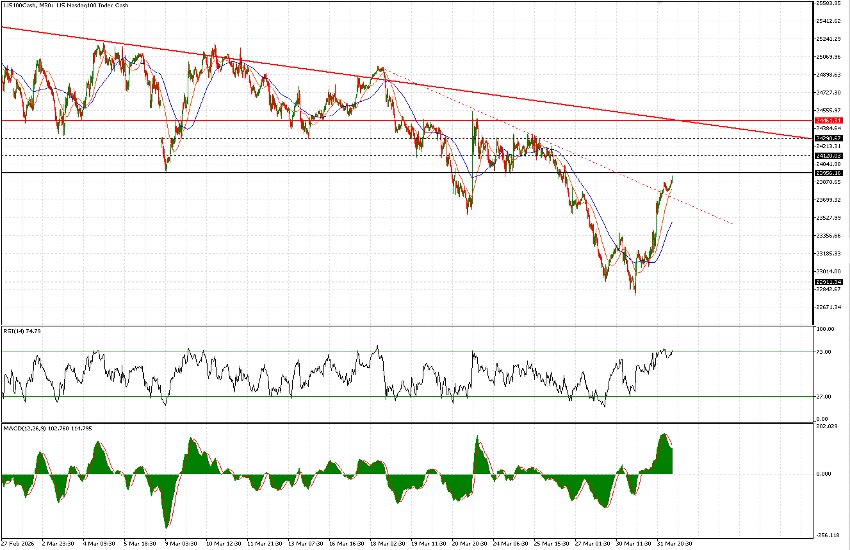 Zooming into the 30-minute timeframe provides a more granular view. First, the minor short-term downtrend line has been broken. The natural upside targets now appear to be twofold: the first is a retest of 23,950 from below. It cannot be ruled out that this level may be breached in a volatile or “dirty” move which—despite its technical significance—could extend prices toward approximately 24,450.