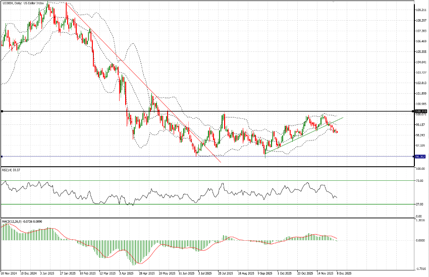 In a week packed with macroeconomic releases—one that will see four major central banks, including the Federal Reserve, announce potential changes to their monetary policy—the USD Index (USDX) begins trading at 98.63. This places the index closer to its H2 2025 highs (100.35 recorded on 20 November) than to its semiannual lows (95.85 reached on 17 September). This soft tone persists despite Fed Funds futures implying an 87.2% probability of a rate cut this Wednesday.