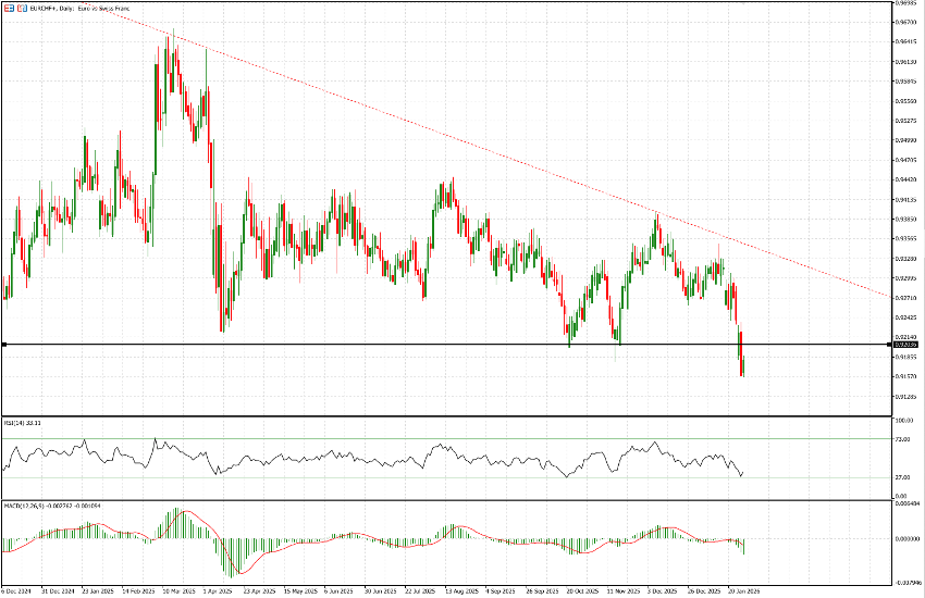We conclude this chart-heavy update with an additional observation unrelated directly to the USD. EUR/CHF is showing signs of weakness, reflecting the pronounced strength of the Swiss franc—likely, at least in part, linked to the ongoing rally in gold. The pair is currently struggling around the 0.92 support area, trading near 0.9183, without yet achieving a decisive break. This is a level worth monitoring closely in the coming sessions.